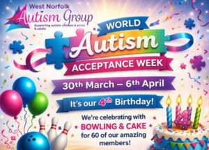West Norfolk Autism Group is proud to be celebrating World Autism Acceptance Week (30th March – 6th April) — and this year is extra special as it’s also our 4th birthday!